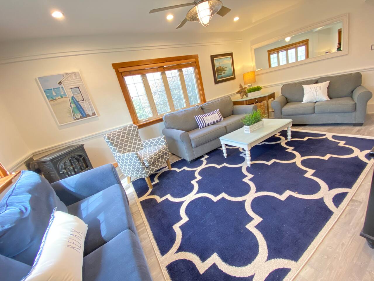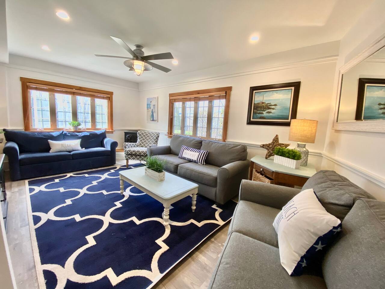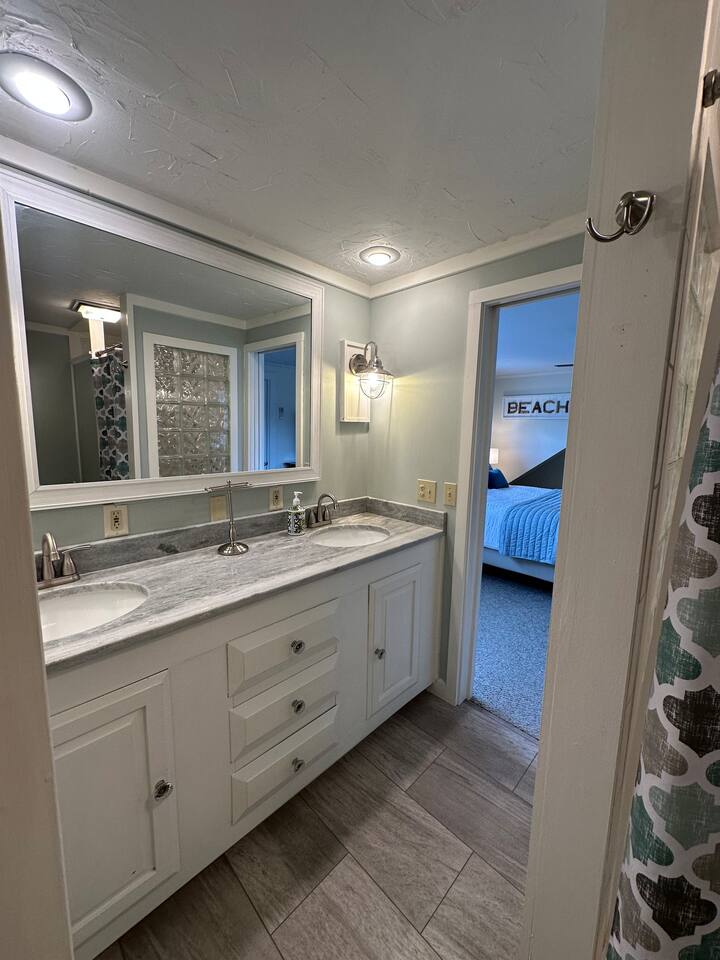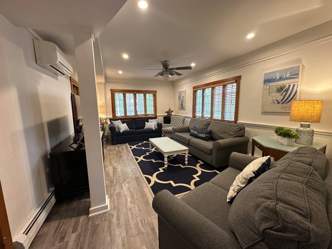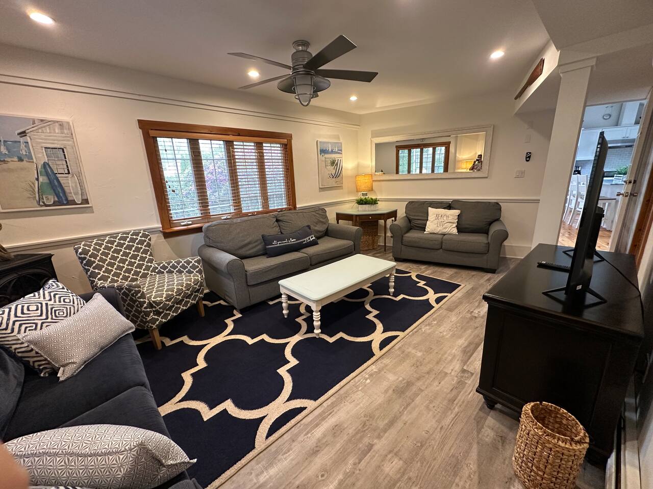 We have four bedrooms and sleeps 10 comfortably. (Second floor Queen bed master with a little twin bed kids corner attached for a young child, another Queen bed room, a twin bed over full bed bunk room, a room with 2 full beds and then 1 pull out sofa in the living room, if needed). There is one full bathroom with tub/shower combo and two en suite bathrooms with showers and double vanities. Our spacious kitchen is bright and fully equipped with granite countertops, stainless steel appliances, and an island with seating. The dining area comfortably accommodates 10, perfect for gathering with your group. The generous TV/living room features a 55” smart TV, three sofas, and a cozy chair, offering plenty of space for everyone to gather around the mini gas fireplace (or A/C) and unwind after a long, salty day or during a rainy afternoon. Adjacent to the kitchen, you'll find a cozy conversation nook with club chairs and a second mini gas fireplace, creating the perfect spot for intimate chats. No matter the weather, we’ve got your comfort covered with a brand-new mini-split heating and cooling system. Outside, we offer two private and inviting seating areas. One, just off the main kitchen, features a BBQ, seating for everyone, an oyster shell bar, and a mechanical awning to provide shade in the afternoon and evening. The other, near the kitchenette, is a sunny spot with Adirondack chairs and a double lounger, ideal for relaxing, napping, or enjoying a quiet evening conversation or marshmallow roast by the firepit, away from those calling it an early night. Our spacious backyard is perfect for tossing a frisbee, playing croquet, or enjoying a friendly game of cornhole.