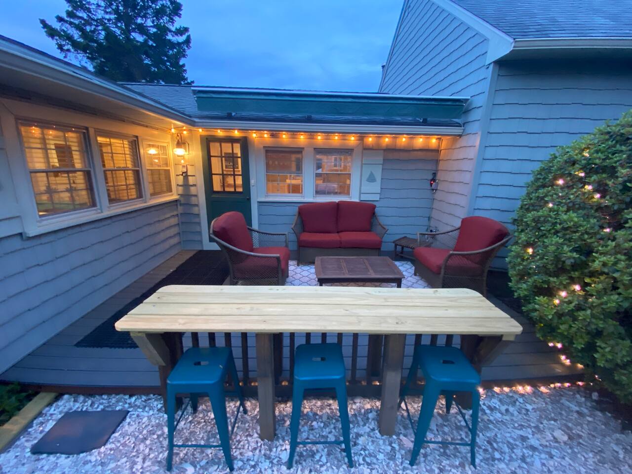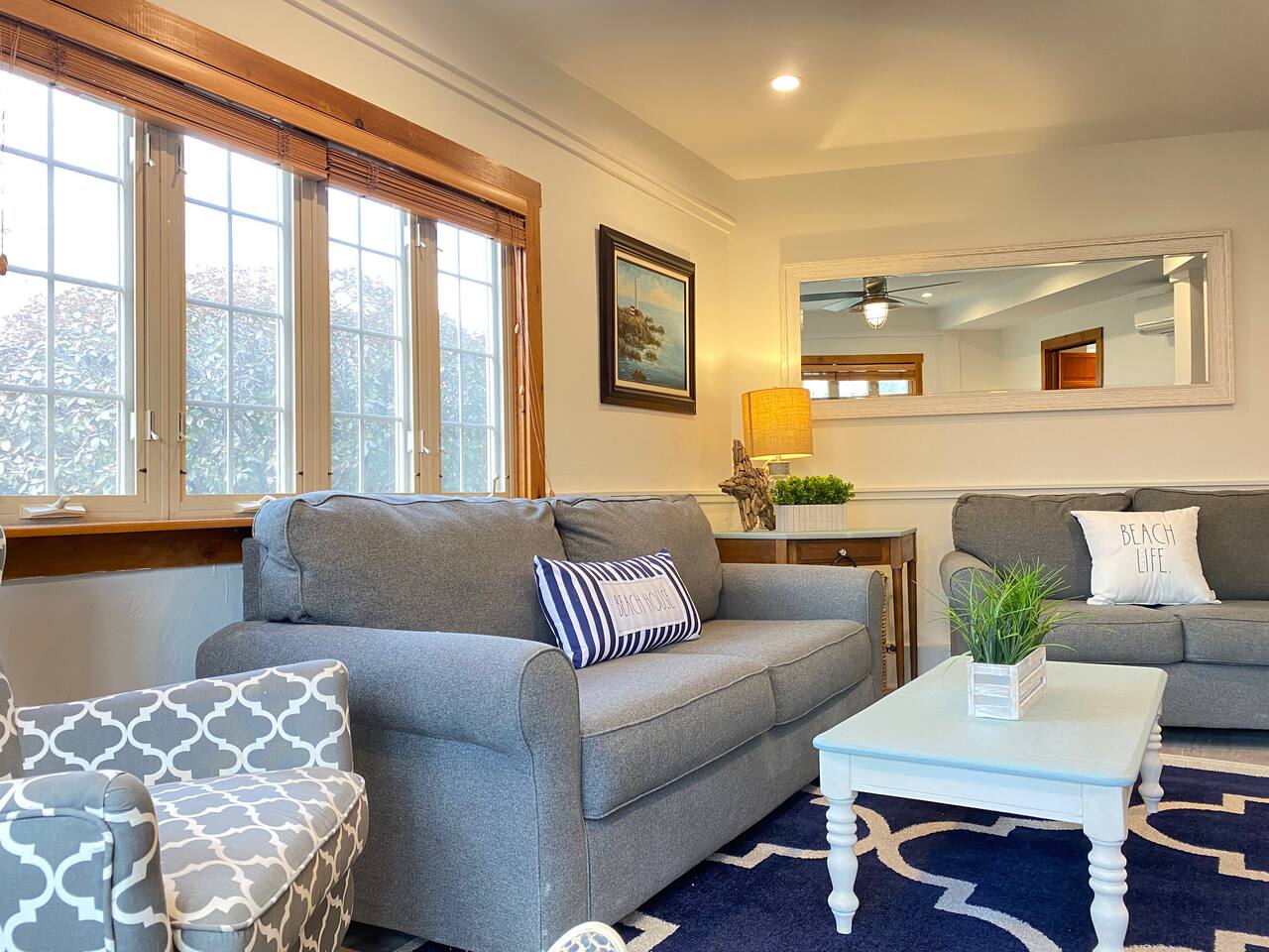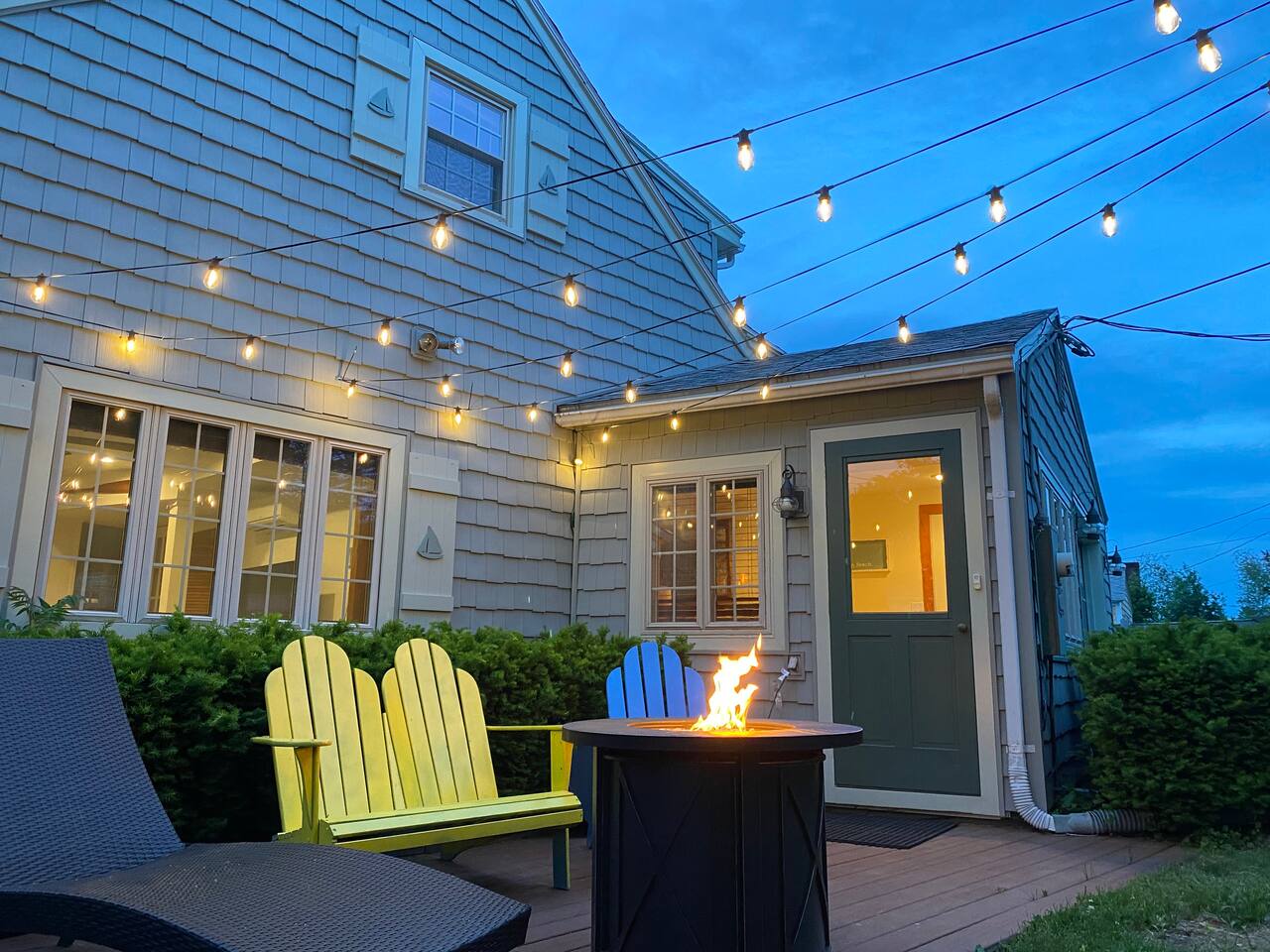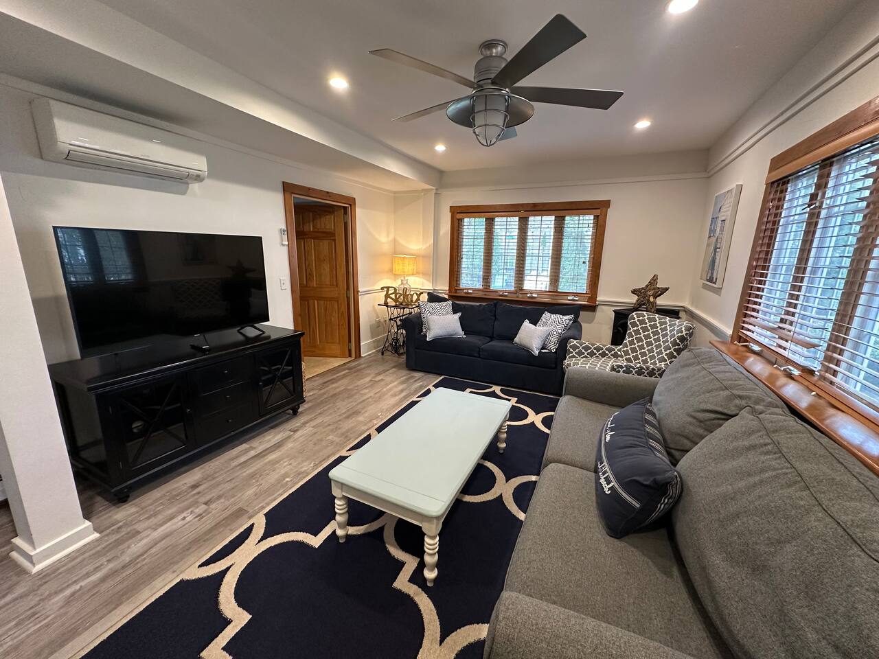 We have four bedrooms and sleeps 10 comfortably. (Second floor Queen bed master with a little twin bed kids corner attached for a young child, another Queen bed room, a twin bed over full bed bunk room, a room with 2 full beds and then 1 pull out sofa in the living room, if needed). There is one full bathroom with tub/shower combo and two en suite bathrooms with showers and double vanities. Our spacious kitchen is bright and fully equipped with granite countertops, stainless steel appliances, and an island with seating. The dining area comfortably accommodates 10, perfect for gathering with your group. The generous TV/living room features a 55” smart TV, three sofas, and a cozy chair, offering plenty of space for everyone to gather around the mini gas fireplace (or A/C) and unwind after a long, salty day or during a rainy afternoon. Adjacent to the kitchen, you'll find a cozy conversation nook with club chairs and a second mini gas fireplace, creating the perfect spot for intimate chats. No matter the weather, we’ve got your comfort covered with a brand-new mini-split heating and cooling system. Outside, we offer two private and inviting seating areas. One, just off the main kitchen, features a BBQ, seating for everyone, an oyster shell bar, and a mechanical awning to provide shade in the afternoon and evening. The other, near the kitchenette, is a sunny spot with Adirondack chairs and a double lounger, ideal for relaxing, napping, or enjoying a quiet evening conversation or marshmallow roast by the firepit, away from those calling it an early night. Our spacious backyard is perfect for tossing a frisbee, playing croquet, or enjoying a friendly game of cornhole.