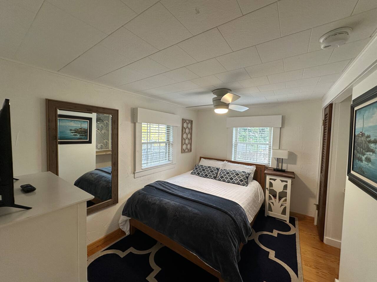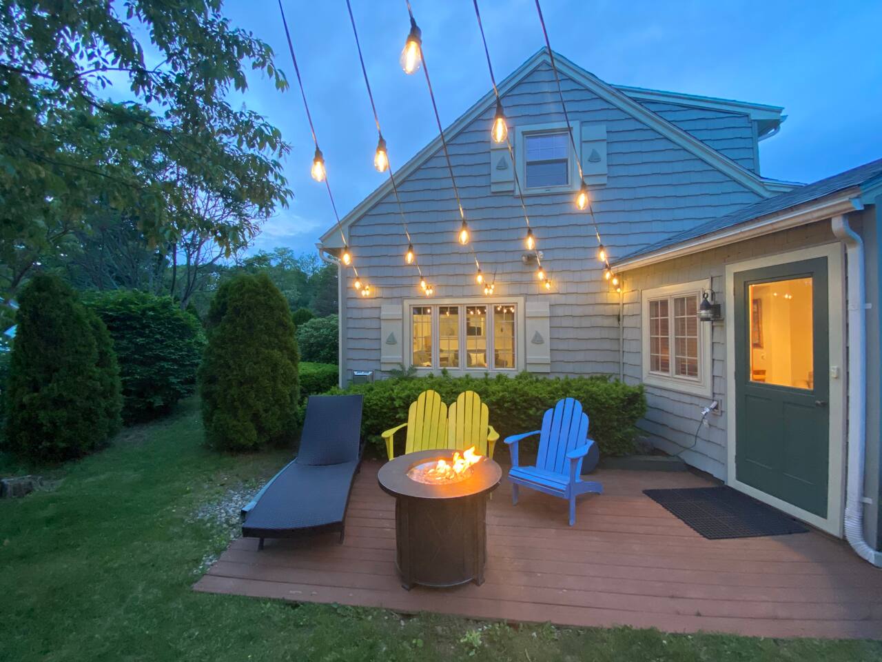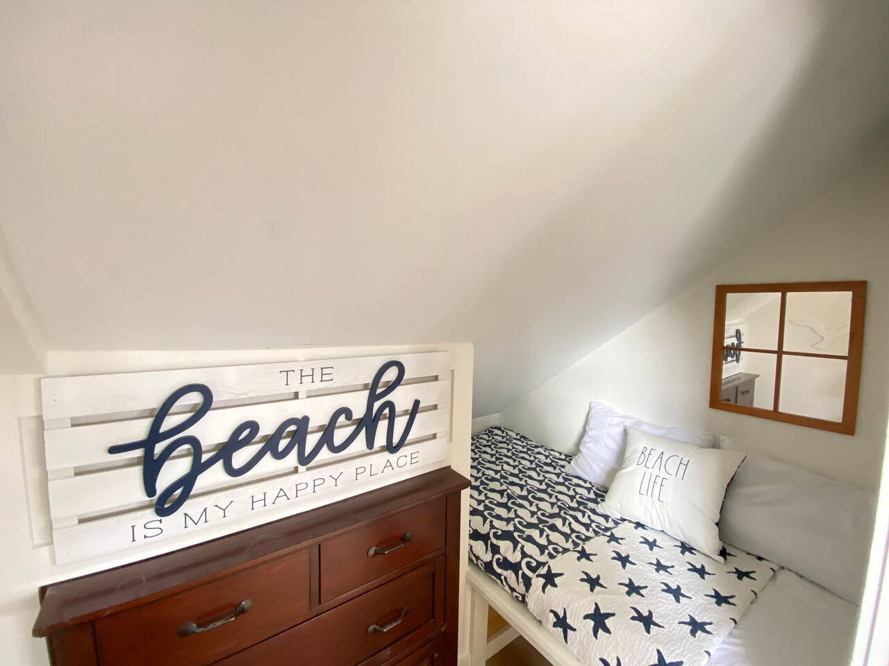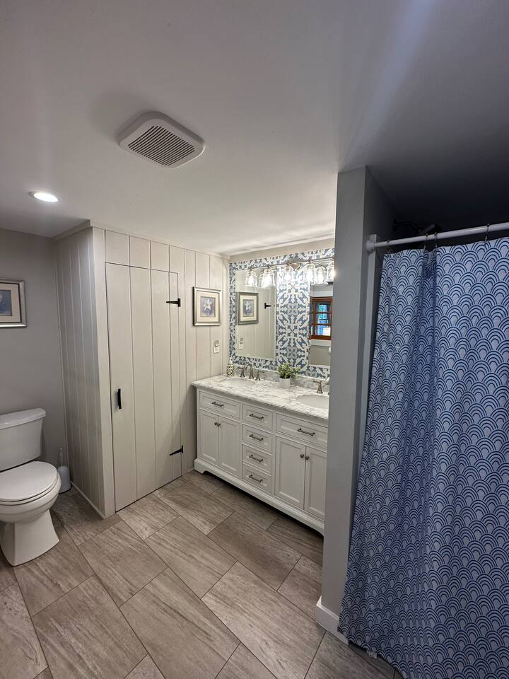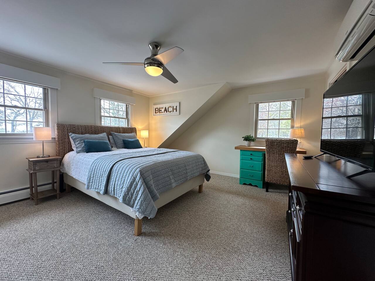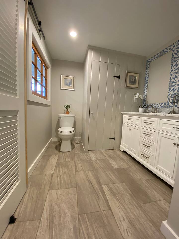 We have four bedrooms and sleeps 10 comfortably. (Second floor Queen bed master with a little twin bed kids corner attached for a young child, another Queen bed room, a twin bed over full bed bunk room, a room with 2 full beds and then 1 pull out sofa in the living room, if needed). There is one full bathroom with tub/shower combo and two en suite bathrooms with showers and double vanities. Our spacious kitchen is bright and fully equipped with granite countertops, stainless steel appliances, and an island with seating. The dining area comfortably accommodates 10, perfect for gathering with your group. The generous TV/living room features a 55” smart TV, three sofas, and a cozy chair, offering plenty of space for everyone to gather around the mini gas fireplace (or A/C) and unwind after a long, salty day or during a rainy afternoon. Adjacent to the kitchen, you'll find a cozy conversation nook with club chairs and a second mini gas fireplace, creating the perfect spot for intimate chats. No matter the weather, we’ve got your comfort covered with a brand-new mini-split heating and cooling system. Outside, we offer two private and inviting seating areas. One, just off the main kitchen, features a BBQ, seating for everyone, an oyster shell bar, and a mechanical awning to provide shade in the afternoon and evening. The other, near the kitchenette, is a sunny spot with Adirondack chairs and a double lounger, ideal for relaxing, napping, or enjoying a quiet evening conversation or marshmallow roast by the firepit, away from those calling it an early night. Our spacious backyard is perfect for tossing a frisbee, playing croquet, or enjoying a friendly game of cornhole.