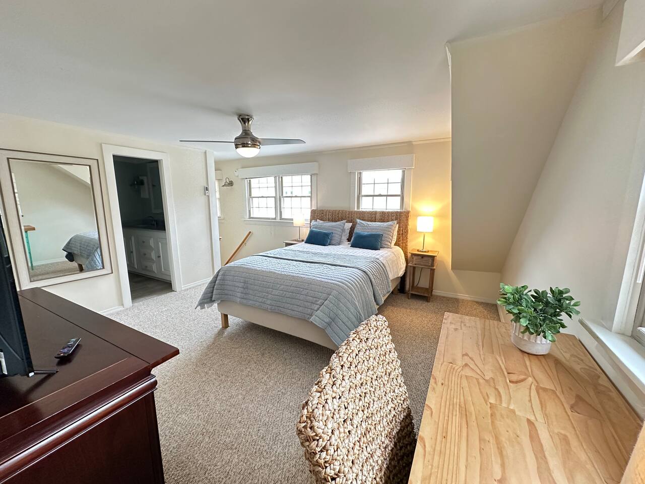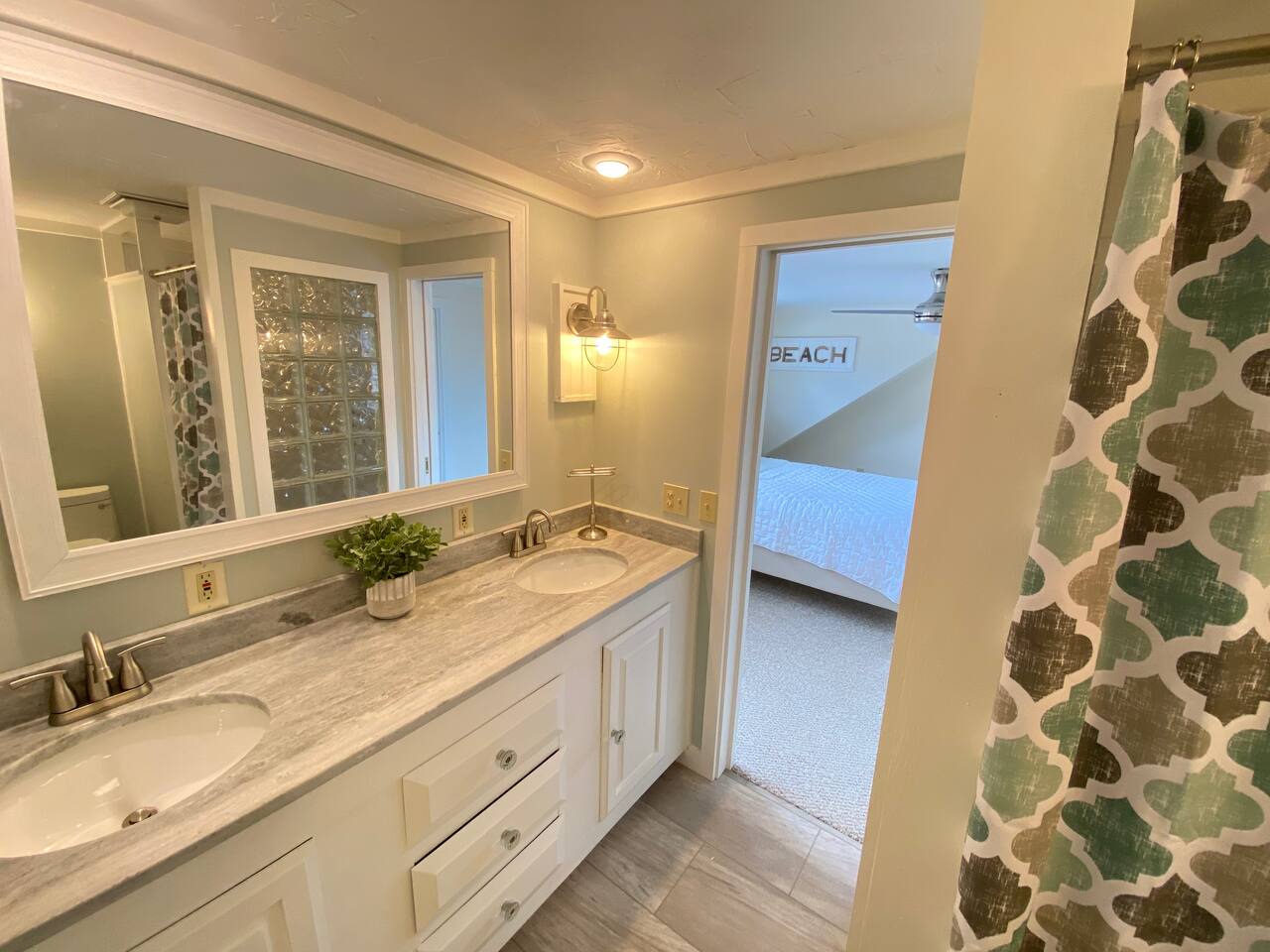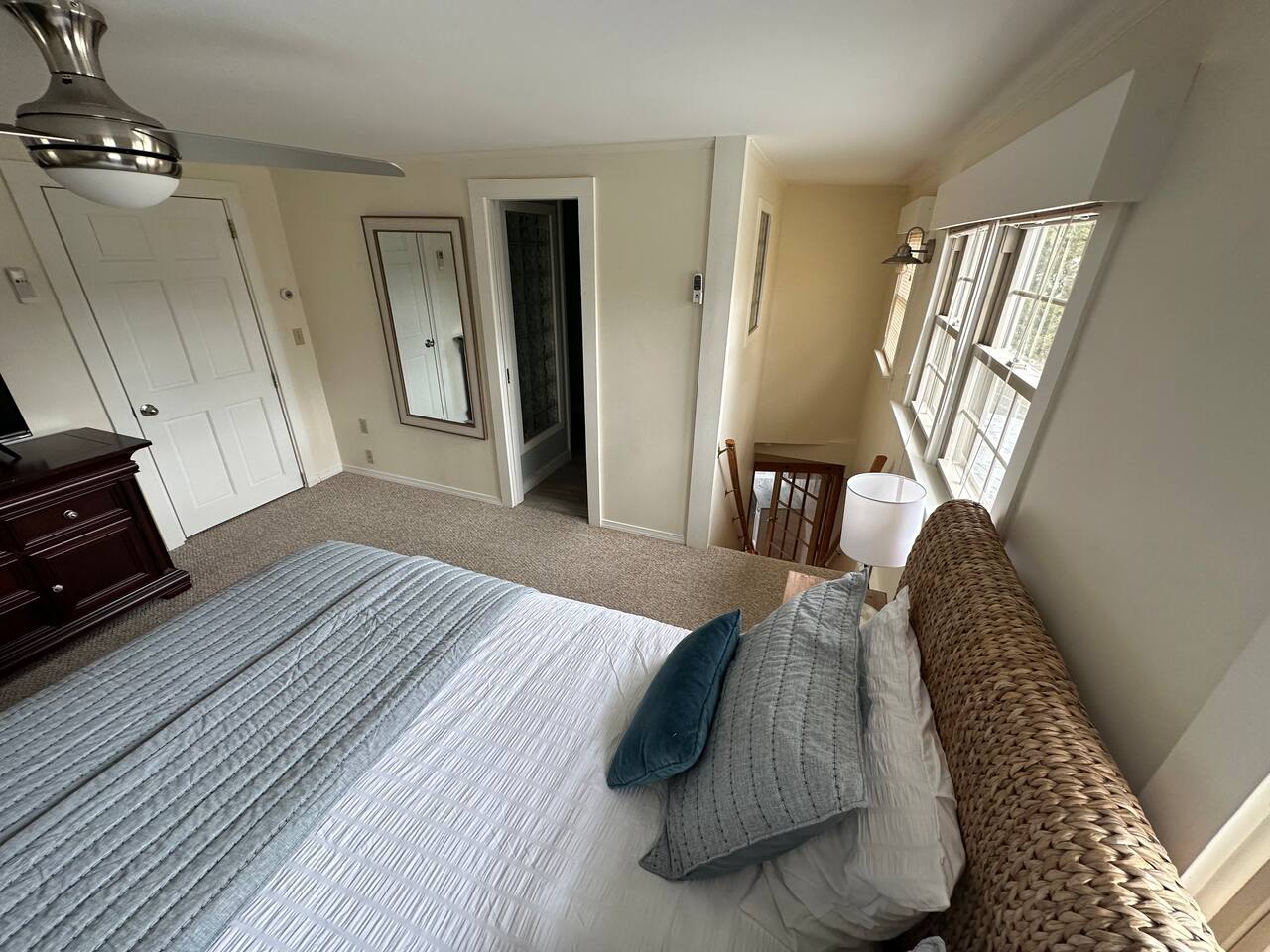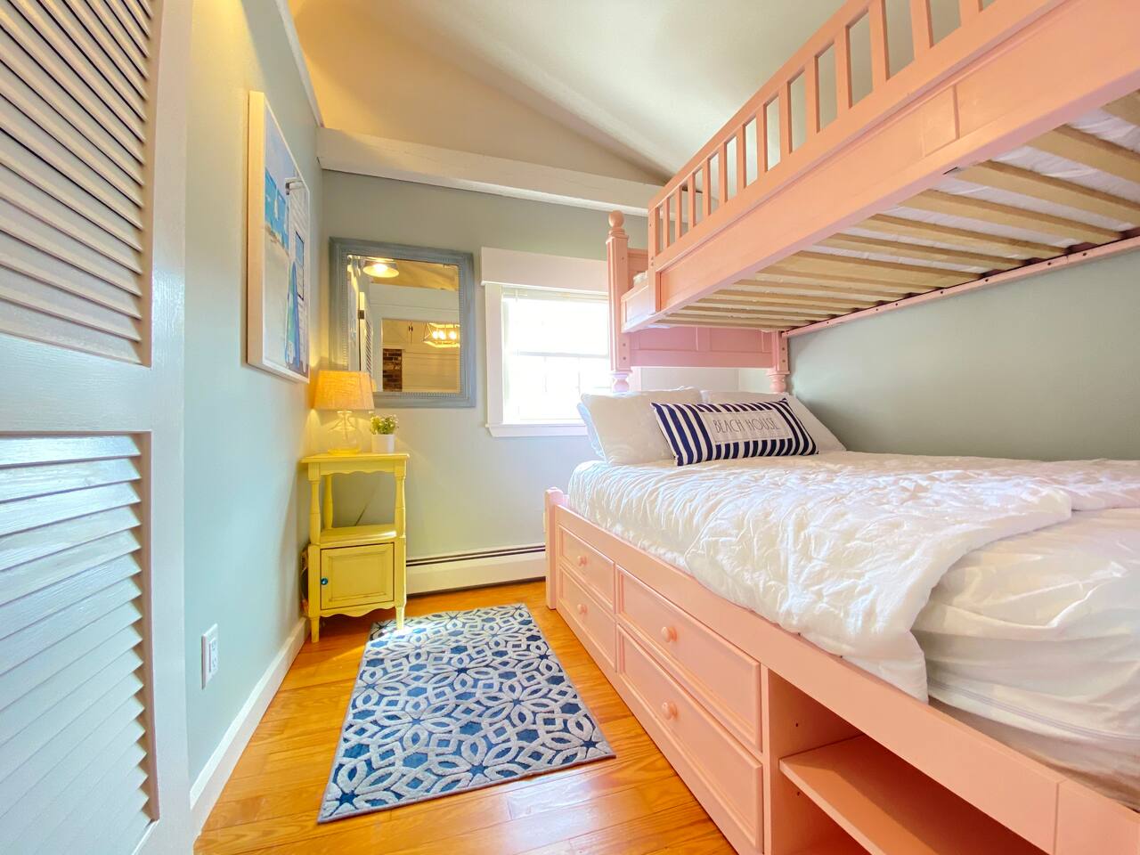 We have four bedrooms and sleeps 10 comfortably. (Second floor Queen bed master with a little twin bed kids corner attached for a young child, another Queen bed room, a twin bed over full bed bunk room, a room with 2 full beds and then 1 pull out sofa in the living room, if needed). There is one full bathroom with tub/shower combo and two en suite bathrooms with showers and double vanities. Our spacious kitchen is bright and fully equipped with granite countertops, stainless steel appliances, and an island with seating. The dining area comfortably accommodates 10, perfect for gathering with your group. The generous TV/living room features a 55” smart TV, three sofas, and a cozy chair, offering plenty of space for everyone to gather around the mini gas fireplace (or A/C) and unwind after a long, salty day or during a rainy afternoon. Adjacent to the kitchen, you'll find a cozy conversation nook with club chairs and a second mini gas fireplace, creating the perfect spot for intimate chats. No matter the weather, we’ve got your comfort covered with a brand-new mini-split heating and cooling system. Outside, we offer two private and inviting seating areas. One, just off the main kitchen, features a BBQ, seating for everyone, an oyster shell bar, and a mechanical awning to provide shade in the afternoon and evening. The other, near the kitchenette, is a sunny spot with Adirondack chairs and a double lounger, ideal for relaxing, napping, or enjoying a quiet evening conversation or marshmallow roast by the firepit, away from those calling it an early night. Our spacious backyard is perfect for tossing a frisbee, playing croquet, or enjoying a friendly game of cornhole.